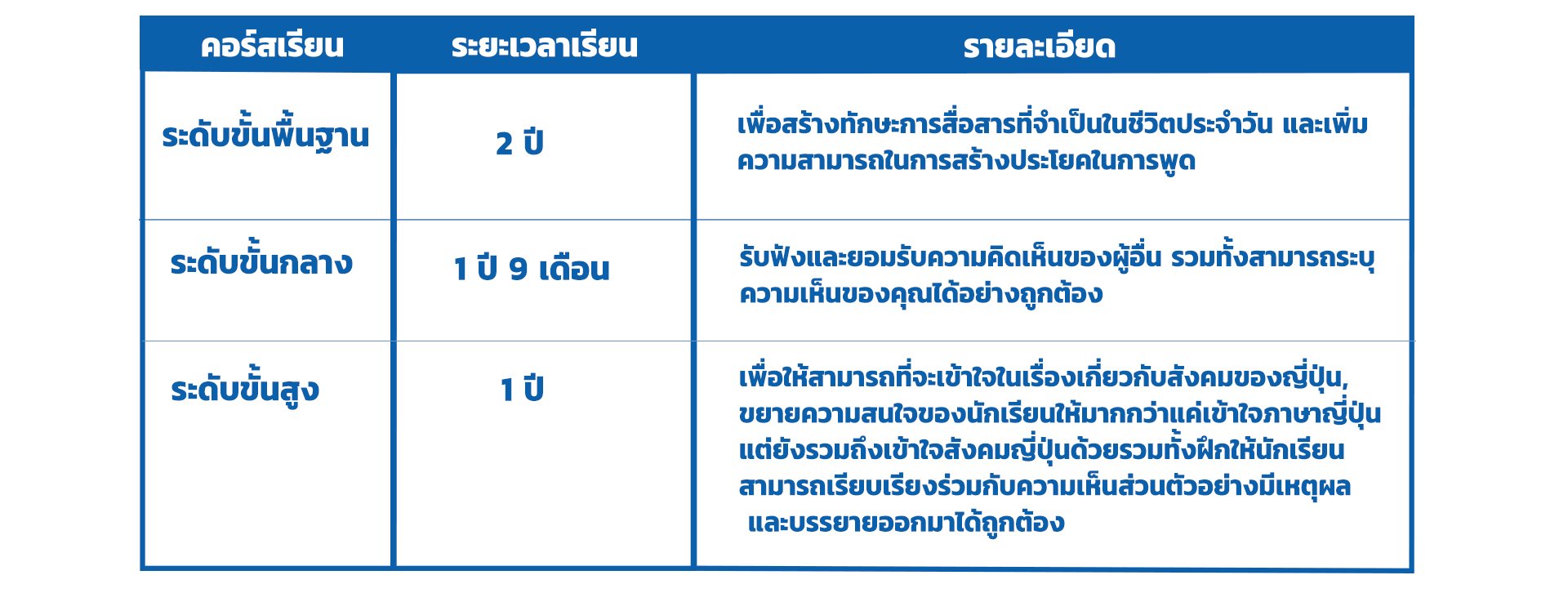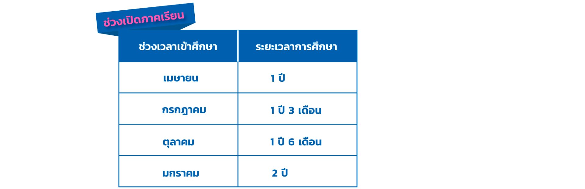 ระยะเวลาหลักสูตร: 1 ปี, 1 ปี 3 เดือน, 1ปี 6 เดือน, 1 ปี 9 เดือน และ 2 ปี